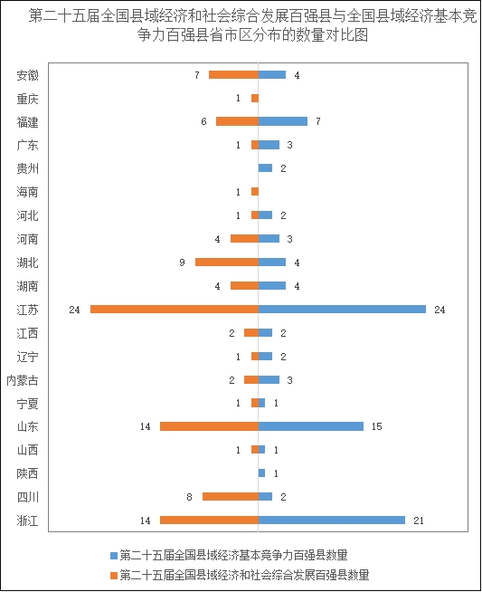 第二十五届全国县域经济百强县与第二十五届全国县域经济和社会综合发展百强县在省市区的数量分布也存在非常大的差异。安徽、河南、湖北和四川等省市区拥有的全国县域经济和社会综合发展百强县数量多于其拥有的全国县域经济百强县数量。