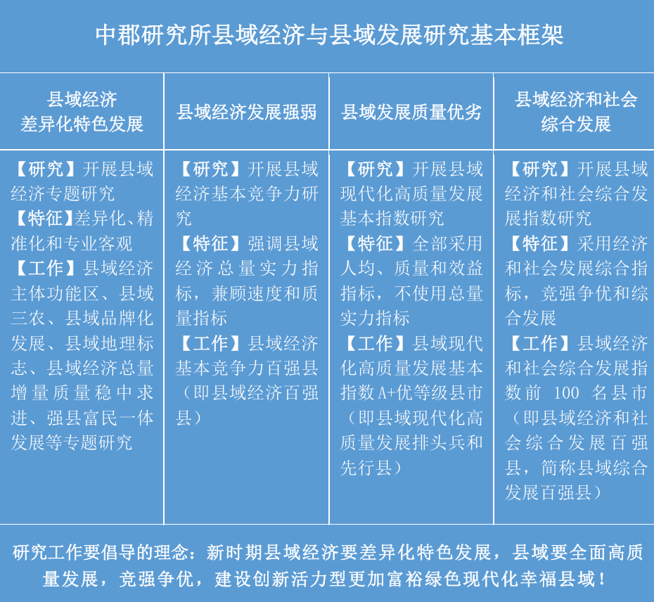 在新时期,县域综合竞争将会取代县域经济单一竞争,县域就业、居民收入、社会安全、社会保障和绿色发展等将会与经济增长一起成为县域经济与县域竞强争优的主题和方向。县域经济与县域发展的工作主线已由“壮大发展县域经济”转为“县域经济与县域高质量发展”。中郡研究所在严格区分和科学界定“县域经济发展”与“县域发展”的内涵和评价规范差异性的基础上,开展“县域经济与县域发展实证研究工作。
