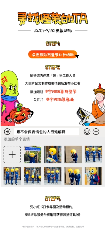 参与方式非常简单,只需轻松三步:第一步,点击预购本次万圣节打卡活动,提前锁定你的参与名额;第二步,在馆内任意寻找一位“装”扮独特的工作人员,用镜头捕捉他们的坚美(或搞笑)瞬间,将照片配上创意文字制作成你的专属表情包,并发布到小红书平台;记得在帖文中添加话题#宁波阪急万圣节,并关注官方账号@宁波阪急商业,与阪急一起见证你的表情包大作!第三步,凭小红书发布界面及活动预约凭证,至B1F总服务台核销,即可领取随机装扮道具一份,为你的万圣造型再加分!