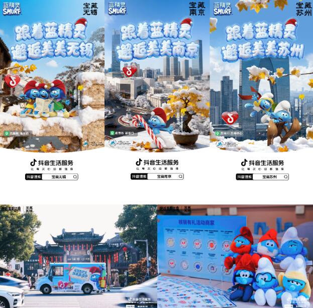 蓝精灵IP的加入,则让江南秋冬更添童趣。抖音生活服务打造蓝精灵主题“美美巴士”,在南京、苏州、无锡三城核心商圈与景区巡游,用户打卡合影、带话题发视频即可领取限定周边与商家优惠券。与此同时,“城市隐藏蓝精灵”打卡活动同步上线,联动40多个商家铺设主题物料,用户跟着巡游地图打卡就能兑换礼品,有效拉动线下交易,12月10日-19日,参与商家扫码核销GMV环比日均增长19.5%。