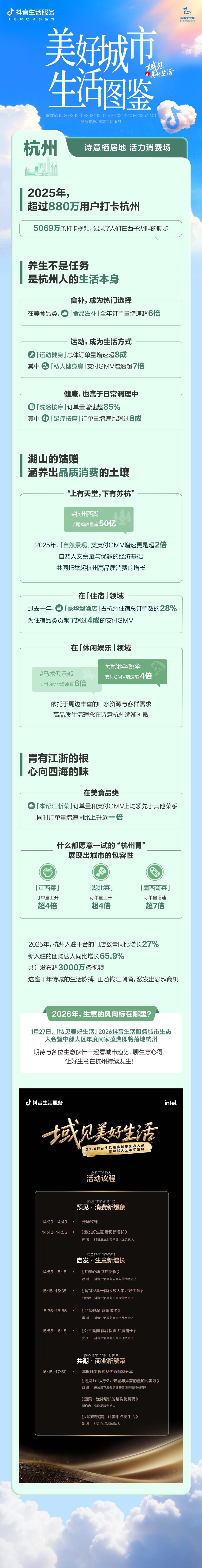 1月25日,抖音生活服务发布《美好城市生活图鉴》。杭州以其独特的湖山资源与对品质生活的追求,在抖音上构建出兼具诗意与活力的消费场域,展现了人文底蕴与现代化消费的完美融合。