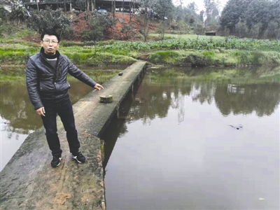 时近14:00,53岁的杨雨从车上卸下渔具,脚伤未愈的他一瘸一拐地走下坡坎小道,走过鱼塘中间的便桥,打算到对面找个地方下饵料。在快要走到便桥尽头时,他隐约发现便桥左侧的水中,似浮着一条裤子。走两步再回头时,杨雨尖叫起来:“水里咋有个娃儿?”