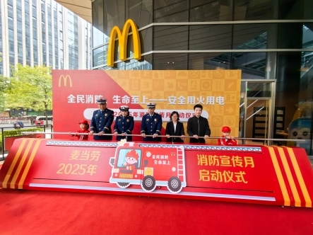 (2025年11月8日,杭州)麦当劳中国连续第十一年开展消防安全主题活动,近日全国超7,300家麦当劳餐厅上线消防安全主题门贴,向社区传递消防安全理念。麦当劳杭州钱投近江餐厅举办了2025年消防宣传月启动仪式,提升广大公众的消防安全意识。11月9日至22日期间,消费者光临主题餐厅并参与消防趣味问答,还可获得限量消防主题贴纸,在轻松互动中提升安全意识。