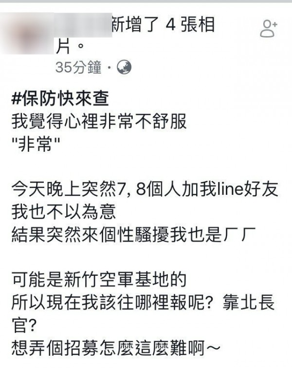 此事虽然一度在网上吸引关注,但这种搭配浓妆女兵的照片随即引发事端,曾参与制作其中一则广告的台军某女兵在网上贴文自称,有男子到她的“脸书”账号发消息骚扰她,吓得她留言急喊:“保防快来查!”